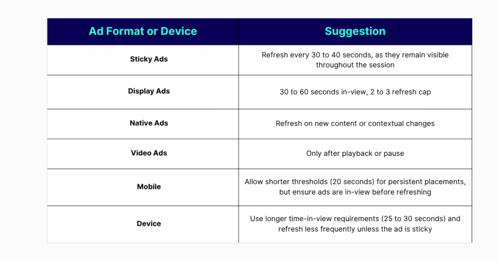 Another advantage is that publishers can set flexible refresh rules based on ad format or placement. Below, you can find some best practices to take maximum advantage of smart in-view ad refresh: