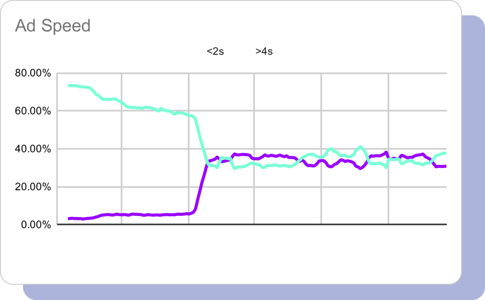 As soon as the lightweight wrapper was implemented, ad delivery performance improved instantly: the share of fast ad server calls (<2 seconds) increased from 5% to 35% (7x higher), while slow calls (>4 seconds) were nearly halved, dropping from 64% to 33%.